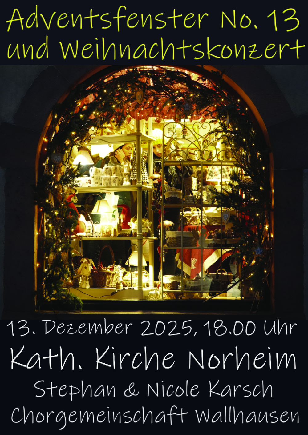 « Alle Veranstaltungen Adventsfenster in Norheim, mitgestaltet von Frauen- und Männerchor 13. Dezember 2025 / 18:00 - 19:00 « Adventssingen in der kath. Kirche Sommerloch Konzert „zum Jahresende“ der Chorgemeinschaft Gräfenbachtal » Zum Kalender hinzufügen Google Kalender iCalendar Outlook 365 Outlook Live Details Datum: 13. Dezember 2025 Zeit: 18:00 - 19:00 Veranstaltungsort Norheim, kath. Kirche